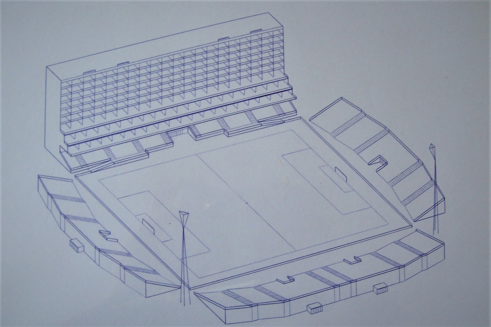 Kiedyś też (ach ta wyobraźnia) opracowywałem koncepcję dla stadionu Uranii, z założeniem istnienia tylko jednej lub dwóch trybun. Oto trybuna główna: